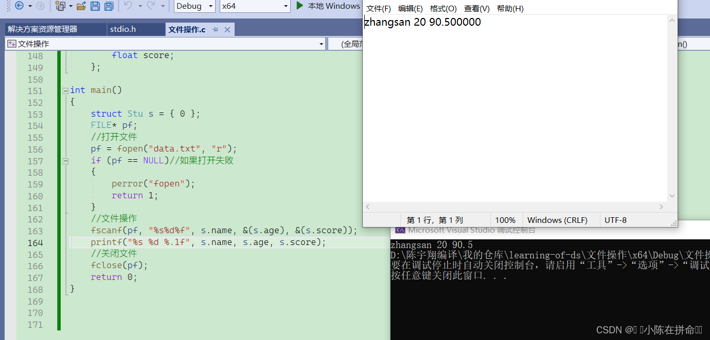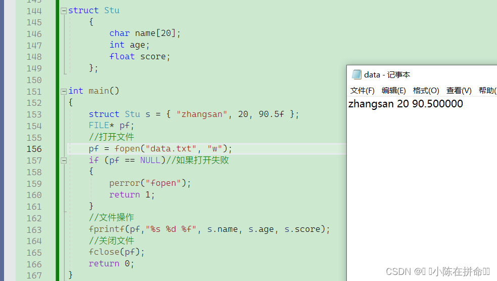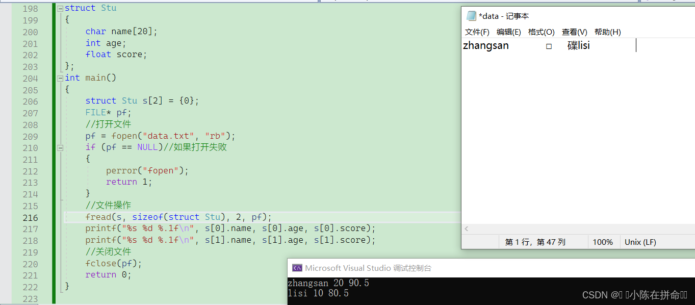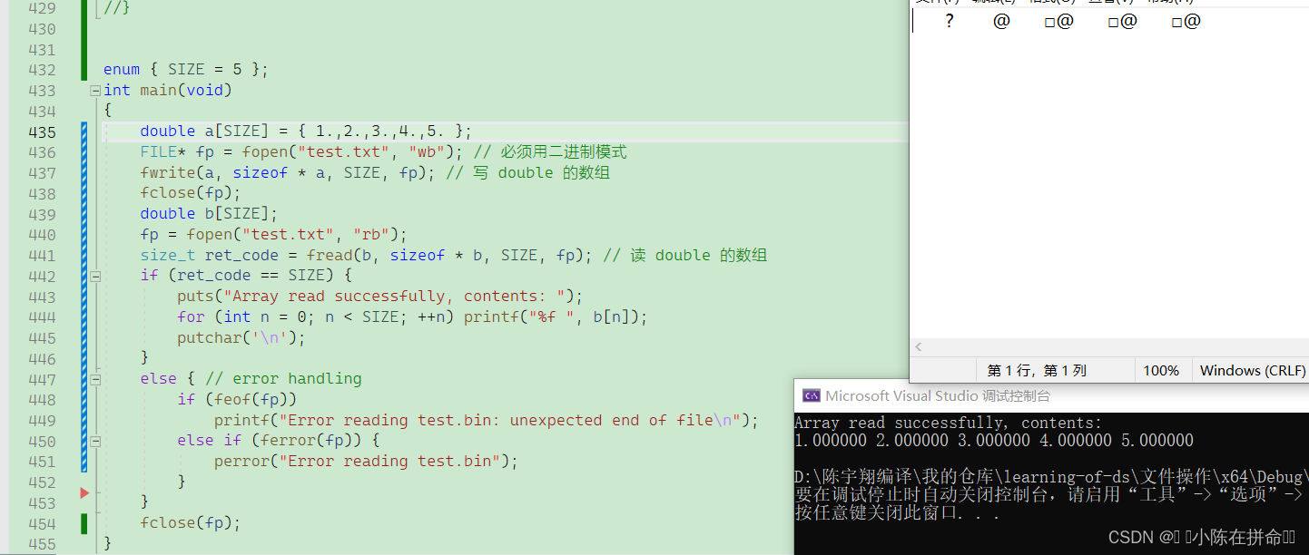 因为是二进制形式,所以我们看不懂,但是编译器可以看懂,所以要使用fwrite就要配套使用fread!!