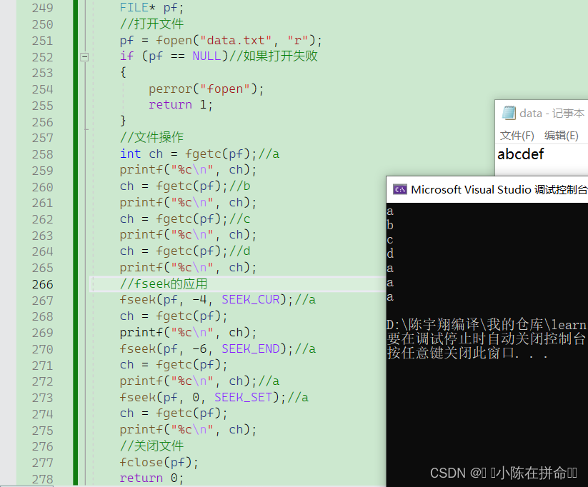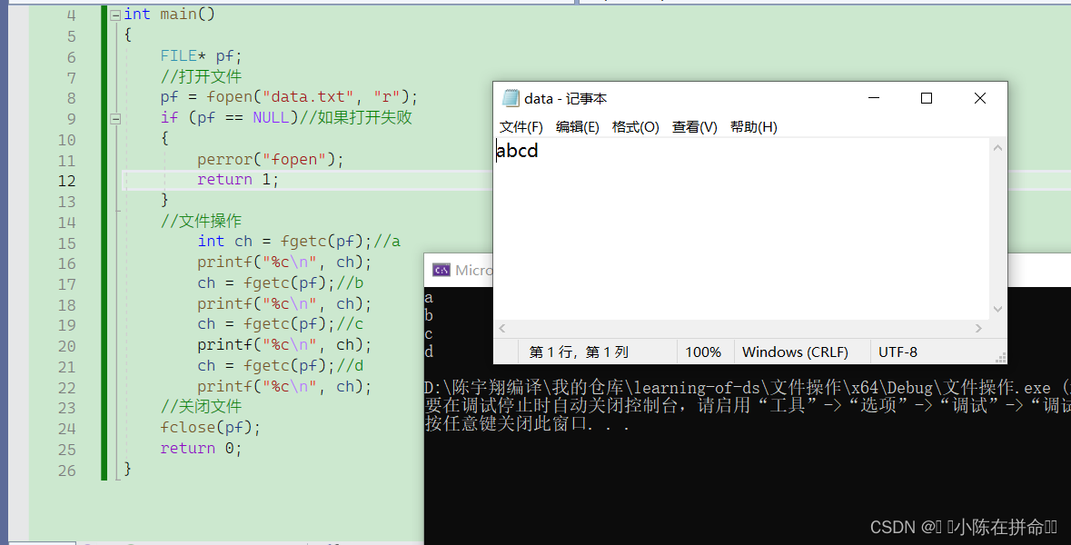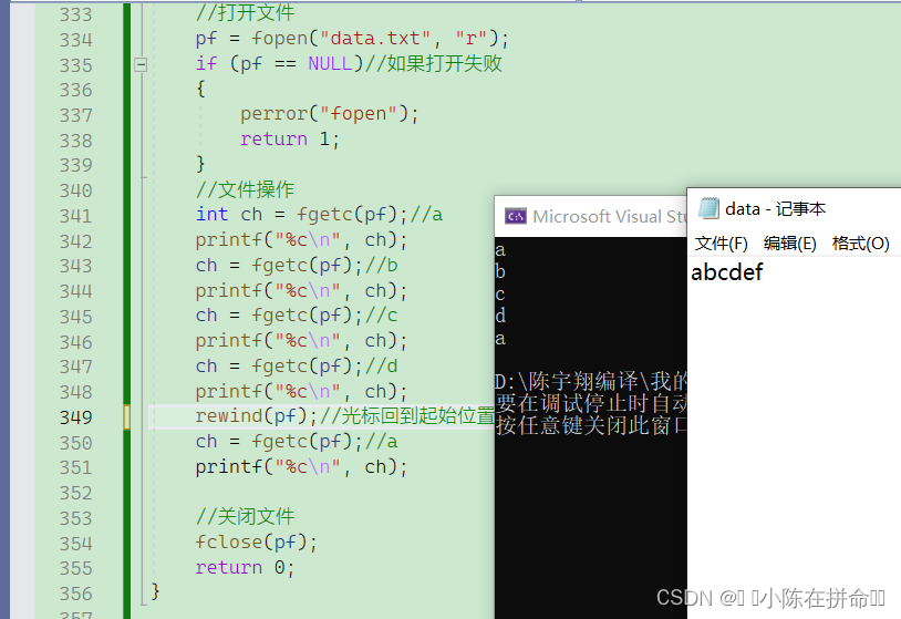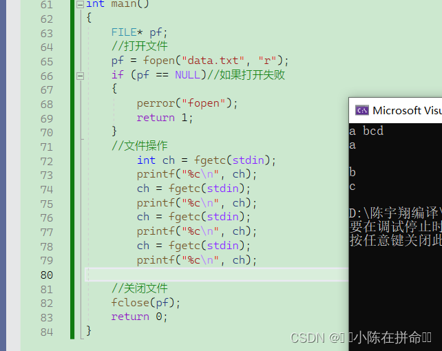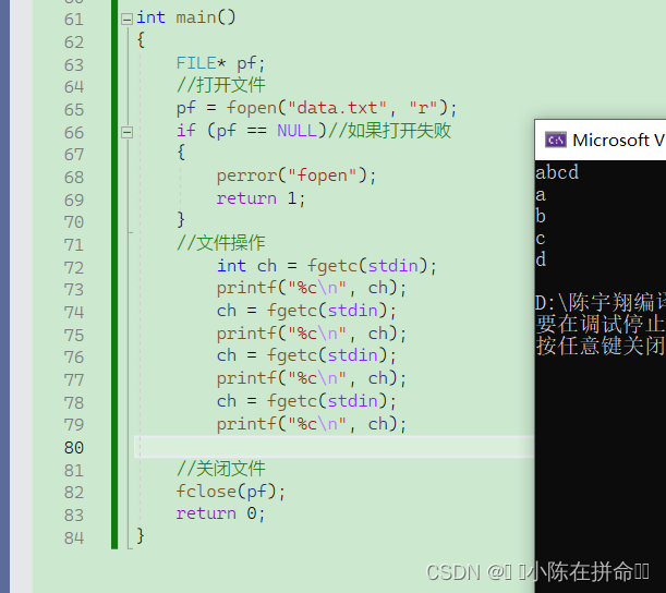 原本文件里有abcd,我们调用了四次fgetc将他读取出来并打印在屏幕上。