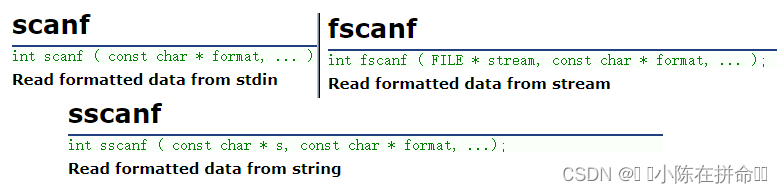 对比一下参数,共同点都是读取一个格式化的数据,不同的是scanf是默认的标准输入流,从键盘上读取,而fscanf是所有的标准输入流都可以,参数可以传文件流也可以跟scanf一样传stdin(标准输入流),而sscanf是从一个字符串中读取。