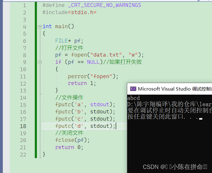 Open file:作用是打开文件返回类型:FILE*指针,我们可以通过该指针完成对文件的读写操作(相当于通过该指针打开了一个文件流)