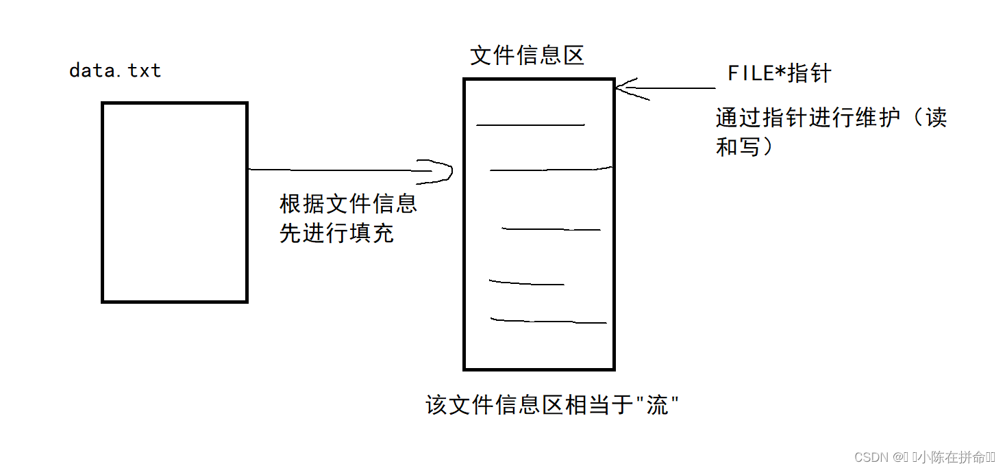 如图,首先我们打开文件,其实就是向内存中申请了一块空间,该空间的类型是FILE类型,我们把它称为文本信息区,该文本信息区首先会根据原有的文本信息进行填充,之后再由操作者利用FILE*指针对这个文本信息区进行读或者写的操作,我们程序员不需要知道文件(data.txt)是如何和这个用结构体变量存储的文件信息区建立联系的,我们只需要知道我们可以用FILE*来操作文件,该文本信息区就相当于"流",我们通过"流"和外部设备建立联系。