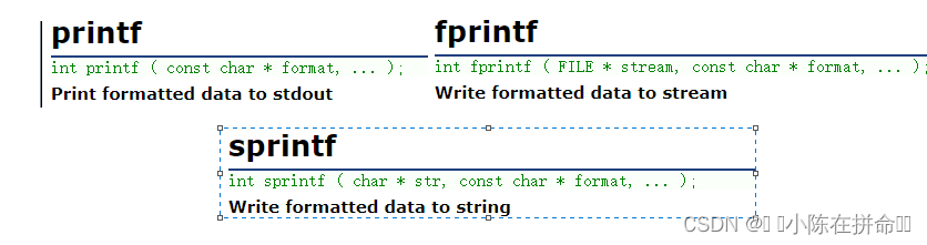 对比一下参数,共同点都是输出一个格式化的数据,不同的是printf是默认的标准输出流,输出到屏幕上,而fprintf是所有的标准输出流都可以,参数可以传文件流也可以跟printf一样传stdout(标准输入流),而sprintf是输出到一个字符串中。