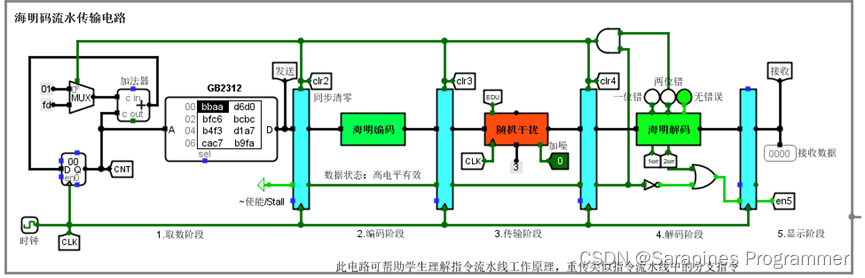 将海明编码传输过程分成了5个阶段(取数,编码,传输,解码,显示)类似 CPU 指令流水线的处理过程。中间蓝色长条为流水接口部件(内部实际是若干锁存器/寄存器,用于锁存数据和控制信号),流水接口部件提供同步清零控制信号,试启用时钟自动仿真运行该电路(CTRL+T),观察接收方接受到的信息,当发生两位错时,将会发生错误。