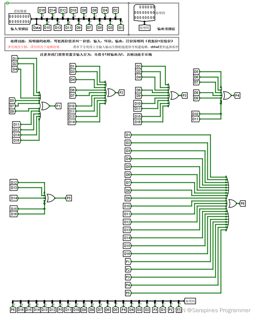2. 如何计算5位海明校验位:k+n<=2^r-1,此时k=16,r=5(有5位的校验位),因此总的数据位数有16+5+1(总的奇偶校验位)=22位。设校验位为Pi(i=1,2,3,4,5),分别位于22位数据的第2的i-1次方的位置上,故分别位于第1,2,4,8,16位上,按此设计电路即可通关。