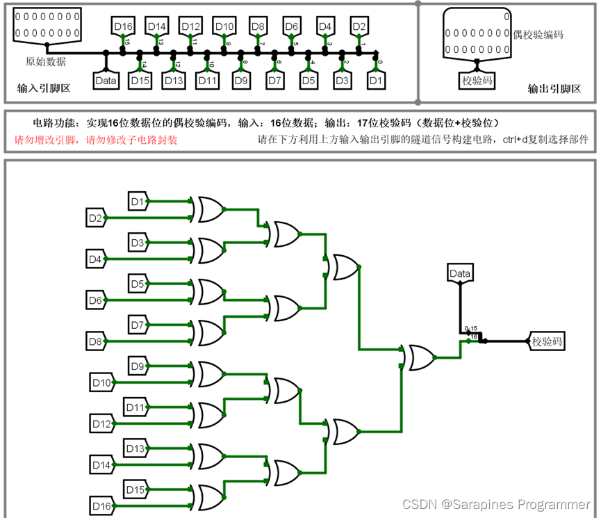 在 logisim 中打开实验资料包中的 data.circ 文件,在对应电路中完成偶校验编码电路。输入:16位原始数据;输出:17位校验码(16位数据位+1位校验位),其中校验位存放在最高位,注意输入16位原始数据的每一位都已经通过分线器利用隧道标签引出,可以直接复制到绘图区使用。