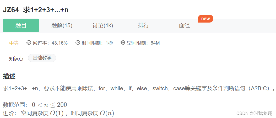 因为我们不能使用for while if else switch case等关键字,对于如何实现1 到 n 的遍历就显得十分困难。对此想出的策略有类构造函数,递归两种办法。如何计算注意规避掉公式法就好。