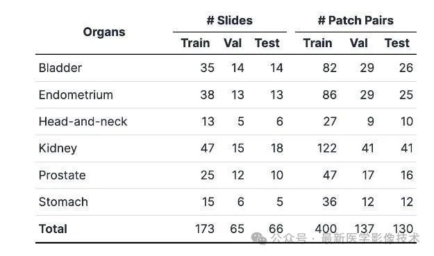 数据集按照 6:2:2 的比例分为三个子集:训练、验证和测试。准确地说,训练、验证和测试分割分别由 400、137 和 130 个块对组成。为了防止数据子集之间的信息泄漏,随机分割每个WSI的数据集,以便来自同一 WSI 的不同块不会包含在不同的分割中。在每个子集中保持一致的癌症类型比率。