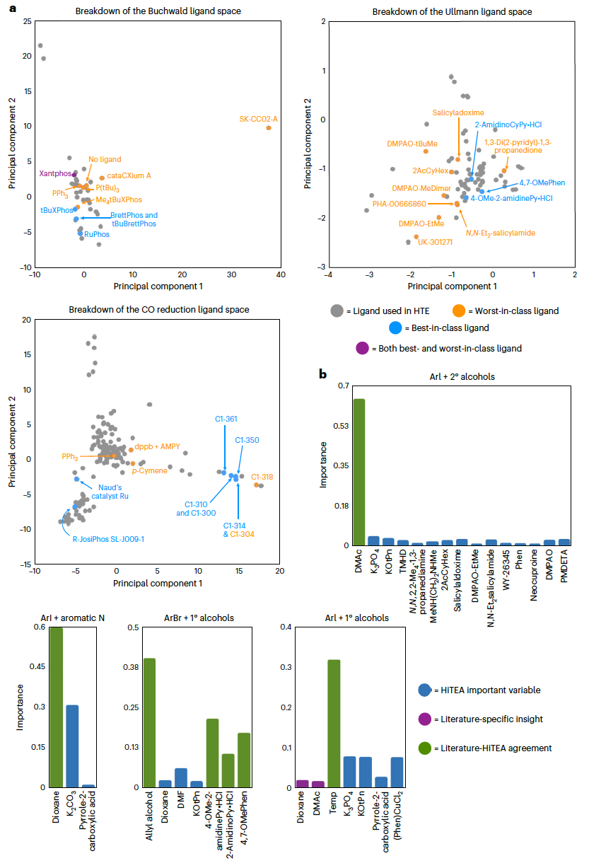 为了测试HiTEA,作者选择了四个不同的反应组进行探索。这些反应组是广泛使用的反应类别:Buchwald-Hartwig偶联、Ullmann偶联、非均相氢化和均相氢化(图1b)。通过生成的反应组,对HiTEA提供的变量重要性、统计上显著的最佳/最差碱和催化剂,以及试剂分布进行了仔细分析,并最终提出了针对性的进一步研究建议。