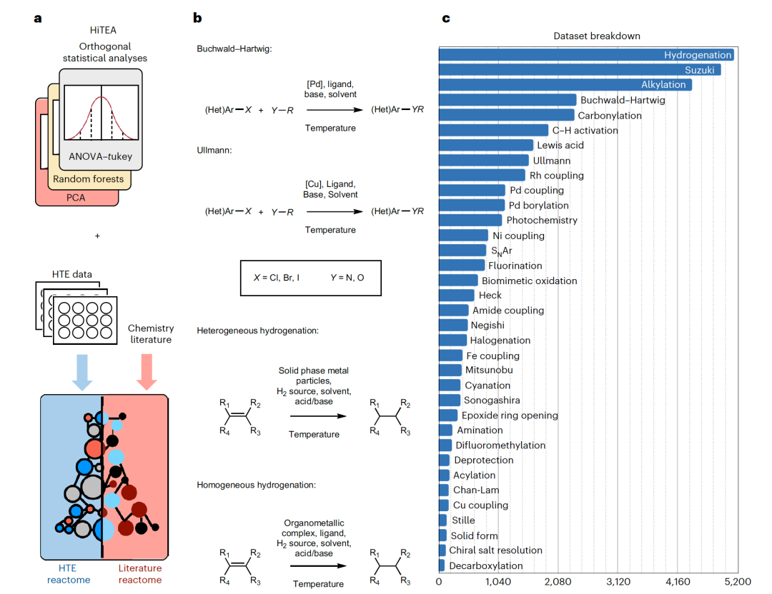尽管存在这些已知的HTE数据挑战,但目前鲜有工作对这些数据集的固有结构和偏差进行研究。应用于任何HTE数据集以提取隐藏的化学洞见的统计上健壮的方法对于推动数据驱动化学至关重要。重要的是要注意,这种统计框架并不是为了预测或概括任何特定的反应属性,而是为了提供更基本的分析:数据集中有哪些化学洞见?从这些结论中,我们可以开始理解:(1)哪些统计上重要的因素驱动了好的或坏的结果;(2)这些数据将教给人工智能(AI)模型什么。最后,通过比较在HTE数据中获得的化学洞见,即“HTE反应组”,与从文献中得出的化学洞见,即“文献的反应组”,可能(1)提供进一步的证据支持机理假设(反应组的一致性),(2)揭示数据集中的偏差,限制了其有效性,或(3)揭示可能导致我们化学理解的细微关联(反应组的不一致)(见图1a)。在这篇文章中,“文献”被定义为来自开源化学数据库和已发表在同行评审期刊的文献信息,不包括HTE数据。