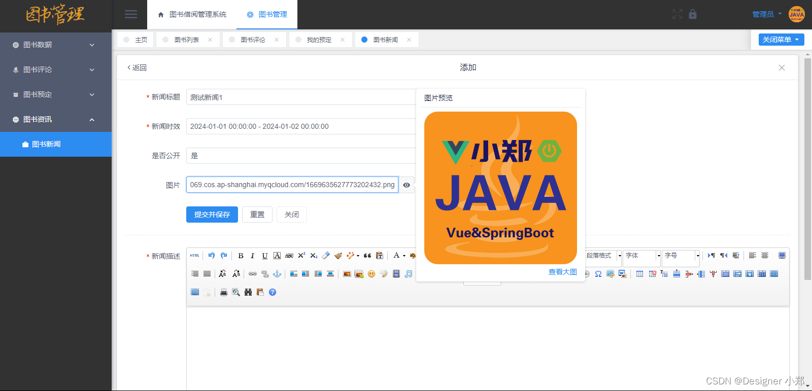 图书管理员可以根据自己的需求,发布关于图书的新闻信息,新闻资讯应当可以包括图片、文字,管理员发布后,用户可以看到这些内容。