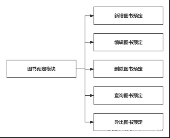 图书预定模块用户保存顾客的图书下单信息,即预约订单数据。当顾客对某个图书进行预约后,系统应当自动生成预订单,顾客可以进入到图书预定模块,对订单进行支付,也可以查询自己的历史下单数据。