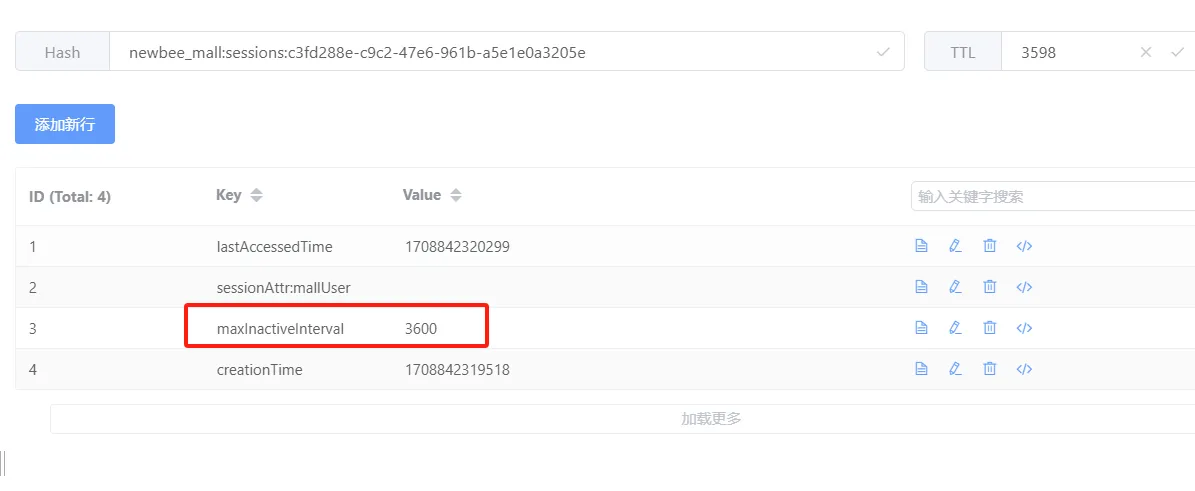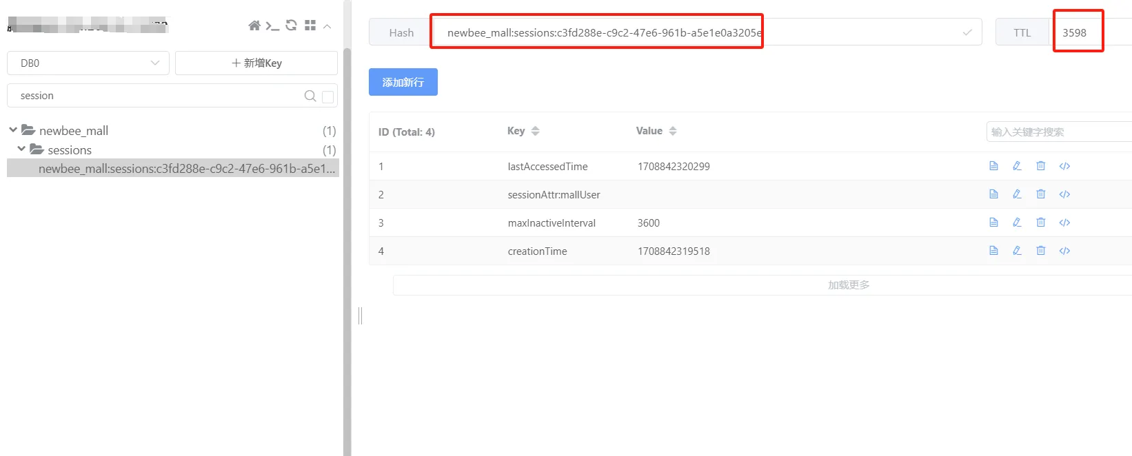 当用户打开 newbeepro 项目前端页面时,用户 session 就已经在 redis 中保存了下来,这一点我们通过查看 redis 客户端发现,此时用户的 session 信息已经存在,并且有效期是 3600 秒与我们 yml 配置的过期时间是一致的。