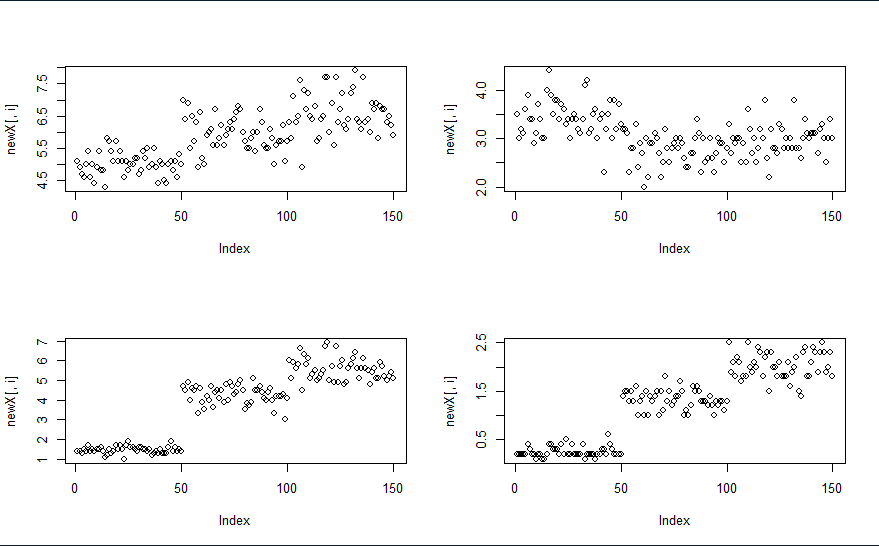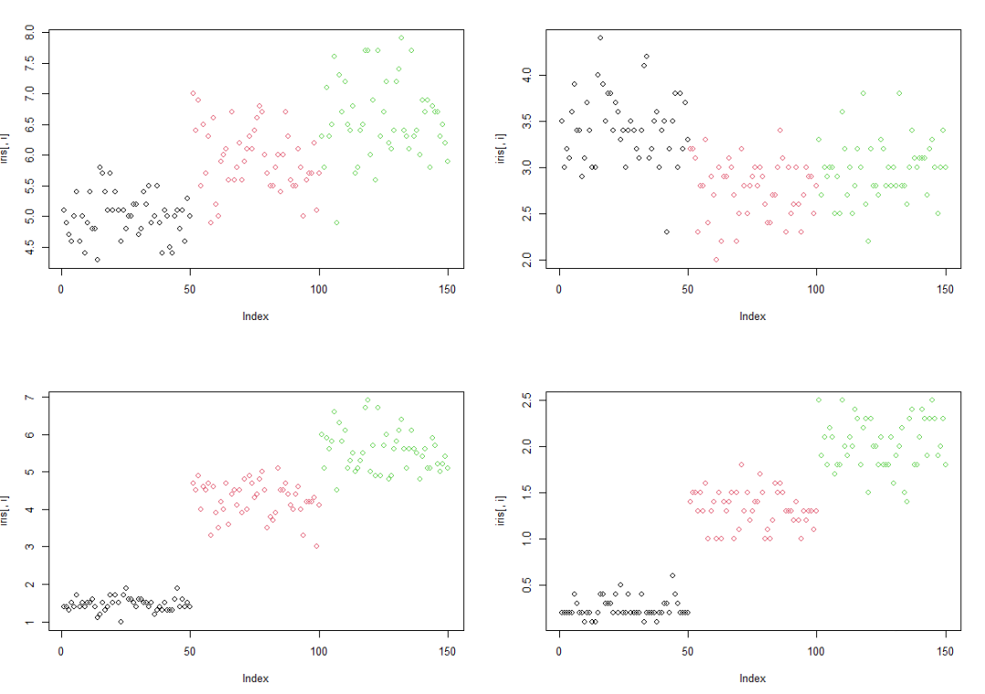lapply(1:4,function(i){plot(iris[,i],col = iris[,5])})
