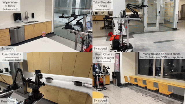 研究人员每个任务只用了50个演示,便让Mobile ALOHA机器人始终如一地做一件事,比如连续9次擦拭洒在桌子上的葡萄酒,连续5次乘坐电梯。