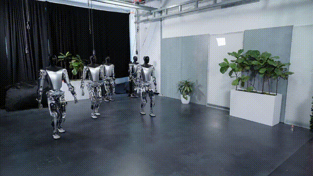 随后特斯拉股东日上,马斯克还展示了5个有模有样的擎天柱原型,同时向前行走。