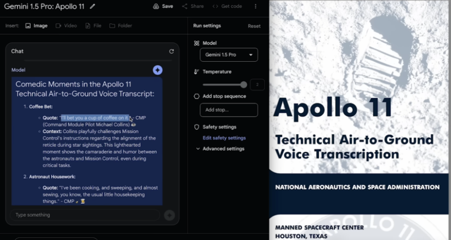 除此之外, Gemini Pro 1.5 能够同时处理文本、图像、音频、视频等大量的多模态信息。例如,研究人员给 Gemini Pro 1.5 提供了一份长达 402 页的阿波罗登月的任务记录,然后向其提问这个脚印所代表的含义,Gemini Pro 1.5 能准确地记住信息并回答:这代表登月的那一刻,是个人的一小步,人类的一大步。