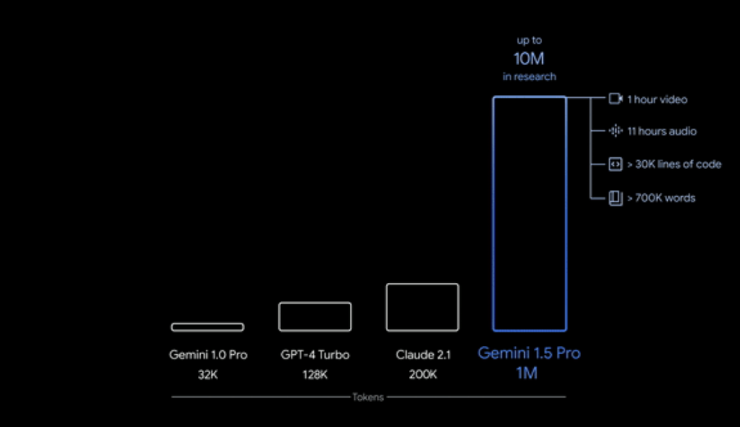 尤其是在长语境理解方面实现了突破,在 GPT-4 能理解的上下文长度是 128K,Claude 是 200K 的背景下, Gemini Pro 1.5 提升至 10M。也就是说,1 个小时的视频、11 个小时的音频、超过 70 万字的代码库,它都可以一次性阅读处理完。