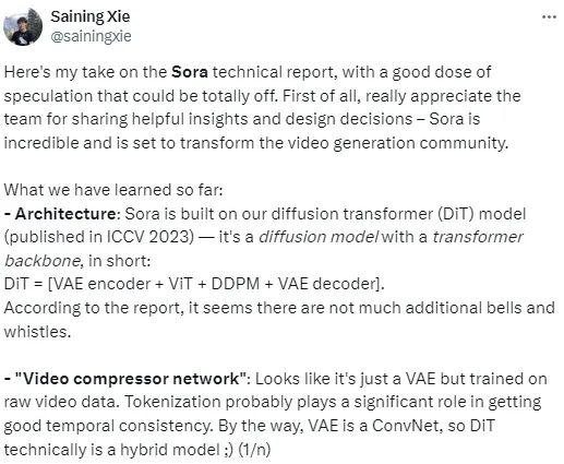 谢赛宁在推特上解读 Sora 与 DiT 模型
