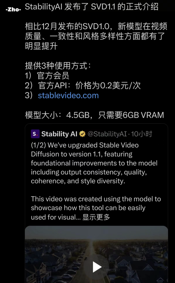 此外,在 2 月16 号发布撞车的还有 Stability 的 SVD1.1,其官网曾发布 SVD1.1 正式介绍的推文,后被删除。