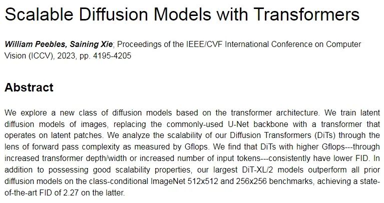 值得一提的是,自 2022 年 5 月至 12 月,William 在 Meta 仅实习不到一年,就与当时仍在 Meta 任职的 AI 技术大牛谢赛宁合作发表了 DiT(Diffusion Transformer)模型,首次将扩散模型与 Transformer 结合起来。此研究发表在 ICCV 2023 上,新鲜出炉的 Sora 就是建立在 DiT 的基础上的。