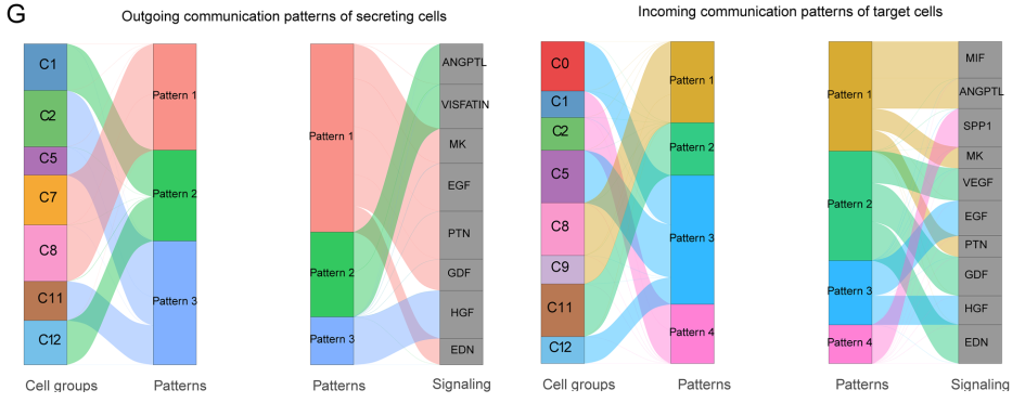 细胞之间的通讯对于执行复杂的生物学功能至关重要,不同细胞群和信号通路之间的协调使这些功能成为可能。作者确定了分泌细胞的三种传出通信模式和靶细胞的四种传入通信模式,以协调信号传导。例如,在 C7 和 C8 肿瘤簇中,传出模式 1 协调 MK、EGF、PTN、GDF 和 EDN 等信号。在 C8 和 C9 肿瘤簇中,传入模式 1 协调 MIF、ANGPTL、MK 和 PTN 等信号(图 6G)。综上所述,肿瘤细胞簇相互作用的细胞间通讯信号更加丰富和复杂。