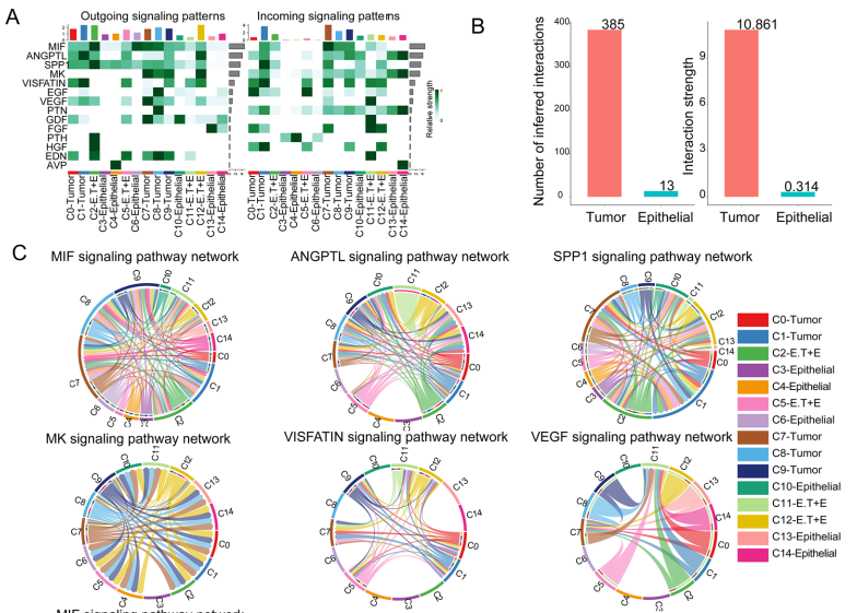 利用 CellChat R 软件包构建了 15 个簇的细胞间通讯图谱,包括来自正常样本和 ccRCC 样本的总共 5856 个细胞。首先,我们确定了 15 个细胞簇中对输出和输入信号贡献显著的前 14 条信号通路。在这些途径中,根据其贡献值排名前 5 位的是 MIF、ANGPTL、SPP1、MK 和 VISFATIN(图 4A)。与上皮细胞相比,肿瘤细胞的细胞间通讯网络表现出显着更高的相互作用次数和相互作用强度(图4B)。VEGF靶向治疗是晚期RCC的一线治疗。我们通过前 5 个信号通路以及 VEGF 信号通路确定了簇之间的复杂相互作用(图 4C)。