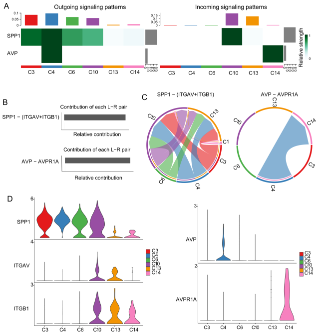 正常上皮细胞之间的细胞间通讯对于维持生理功能至关重要。作者在六个关键的上皮细胞簇中鉴定了两种主要的生理性细胞间信号通路,SPP1 和 AVP(图 5A)。这些细胞簇之间的通讯主要由L-R对SPP1-(ITGAV + ITGB1)和AVP-AVPR1A介导(图5B,C)。特异性信号分子(SPP1、AVP)由细胞簇分泌,而表达相应受体的簇(ITGAV + ITGB1、ACPR1A)则作为靶细胞(图5D)。这些信号分子与靶细胞表面受体的相互作用建立了不同细胞簇之间的通讯通路。