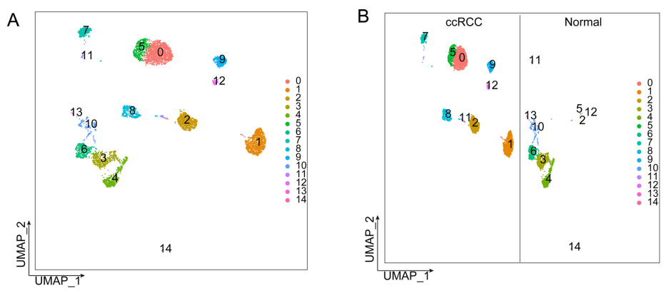 在ccRCC样本中鉴定了9个细胞簇,在正常样本中鉴定了10个细胞簇。值得注意的是,在两种类型的样本中都观察到簇 2、5、11 和 12,表明这些细胞具有可比的转录特征。相比之下,簇 3、4、6、10、13 和 14 是正常样本独有的,而簇 0、1、7、8 和 9 是 ccRCC 样本独有的(图 2B)。因此,文中注释了簇 2、5、11 和 12 以及来自正常样本的簇 3、4、6、10、13 和 14 作为上皮细胞。