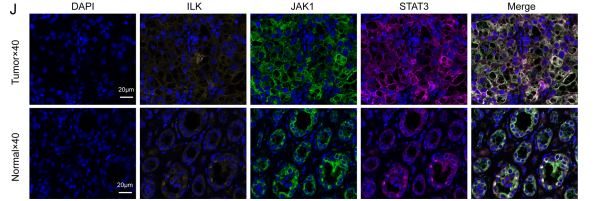 多重免疫荧光染色进一步显示 ccRCC 样品中 ILK、JAK1 和 STAT3 的表达升高(图 8J)。这些结果表明,SPP1信号通路可能通过激活靶细胞中的ILK、JAK/STAT等细胞内信号来促进恶性表型的发展。
