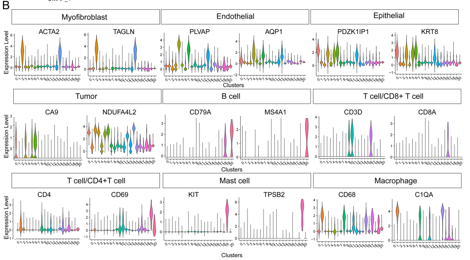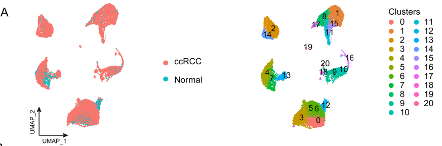 根据经典细胞标记基因的表达注释细胞簇(图1B),并最终将21个细胞簇分为9种不同的细胞类型(图1C)。在第 0、3、5、6 和 12 簇中,肿瘤细胞和上皮细胞之间的标记基因表达存在重叠,导致 ccRCC 组织中肿瘤细胞和上皮细胞的不准确区分(图 1B 中的上皮和肿瘤)。因此该文献暂时将 ccRCC 样本中的簇 0、3、5、6 和 12 标记为“上皮/肿瘤”。相反,肾组织中的簇 0、3、5、6 和 12 被证实为上皮细胞(图 1C)【图1C的最下方】。
