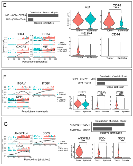 此外,作者发现MIF-(CD74 + CXCR4)和MIF-(CD74 + CD44)是MIF信号通路贡献最大的配体-受体对(L-R对)。受体CXCR4和CD74在肿瘤细胞中的表达显著增加,表明肿瘤中MIF信号通路被激活(图4E)。在 SPP1 和 ANGPTL 信号通路中发现了 L-R 对,并确定相关基因在肿瘤细胞中显着升高(图 4F、G)。综上所述,这部分结果构建了15个细胞簇之间细胞间通讯的一般图谱。