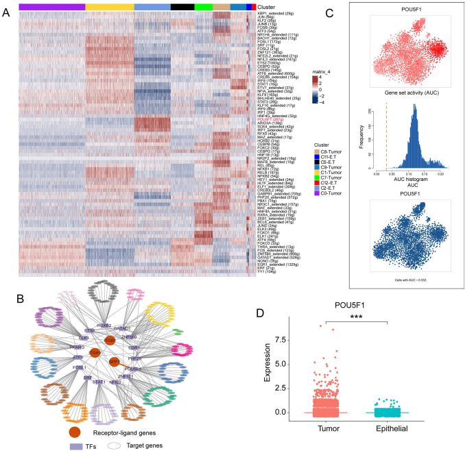 利用 SCENIC R 软件包 (v1.3.1) 分析了 ccRCC 样本中来自 9 个肿瘤簇的 4252 个细胞来鉴定 TF(转录因子)。在 C2-E.T簇中,作者鉴定了5种高转录活性TF(HNF4G、POU5F1、ARID3A、SOX4和IRF7)(图7A)。TF调控网络分析进一步揭示了15个靶向SPP1-(ITGAV + ITGB1)L-R对的TFs,其中POU5F1被确定为SPP1的关键调控因子(图7B)。随后,作者使用 AUCell 量化了 POU5F1 的活性,并在 C2-E.T簇 中观察到富集的 AUC 峰(图7C)。C2-E.T簇同时表现出POU5F1和CD44的高表达,这两个基因是癌症干细胞(CSCs)的公认标志物,表明C2-E.T簇中存在CSCs属性。因此,C2-E.T 簇被指定为 POU5F1 hi CD44 hi E.T 亚群。与上皮细胞相比,POU5F1在肿瘤细胞中的表达显著更高(图7D)。