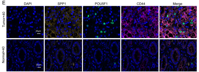 最后,在ccRCC临床样本中观察到SPP1、POU5F1和CD44的强荧光信号,证实了上述现象在蛋白表达水平上(图7E)。鉴定了 CSC 的一个亚群,以及该亚群分泌的 SPP1 信号分子的潜在转录调控机制。