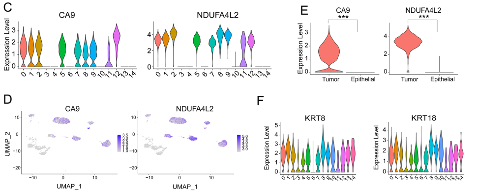 随后,基于经典的ccRCC标记基因,文中发现簇0、1、2、5、7、8、9、11和12的CA9(carbonic anhydrase 9)和NDUFA4L2(NADH dehydrogenase (ubiquinone) 1 alpha subcomplex, 4-like 2)基因表达水平显著升高(图2C-E)。相反,其他簇(3、4、6、10、13 和 14)显示出明显的上皮细胞标志物表达,并且缺乏肿瘤特异性标志物,因此也表明这些簇是上皮细胞(图 2F)。