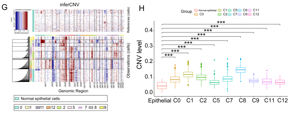 高水平的CNV与癌症的发展密切相关,可用于根据CNV识别可能的恶性细胞。使用来自正常肾组织的 1,604 个上皮细胞作为参考,我们发现 ccRCC 样本的簇 0、1、2、5、7、8、9、11 和 12 中的 CNV 水平显着升高(图 2G、H)。因此,来自 ccRCC 样本的簇 2、5、11 和 12 以及簇 0、1、7、8 和 9 被注释为肿瘤细胞。