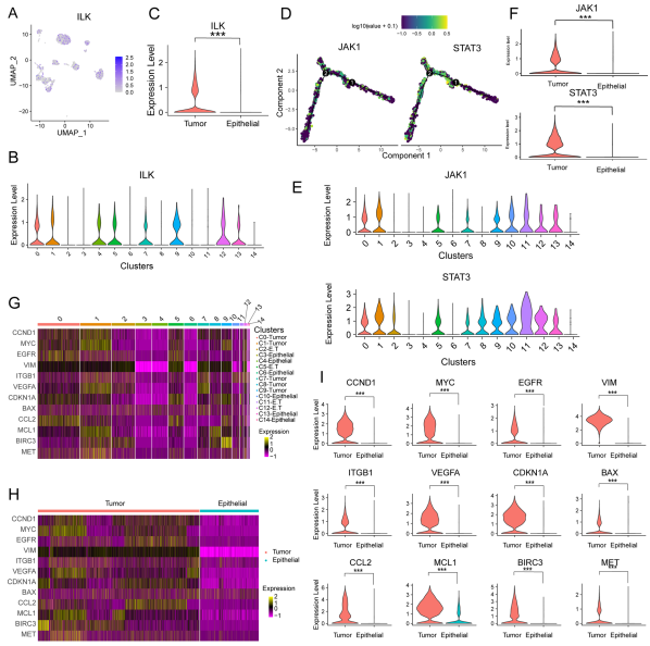 在细胞分泌后,SPP1信号分子与靶细胞表面的整合素受体(αβ1,由ITGAV和ITGB1编码)结合,促进细胞外信号传递到细胞内环境中。信号的转导导致靶细胞极性、基因表达、细胞存活和增殖。为了研究SPP1信号转导对肿瘤细胞的作用,作者分析了来自ccRCC样本的4252个肿瘤细胞和来自正常样本的1604个上皮细胞。整合素介导的信号转导通常需要激活粘附激酶,如黏着斑激酶(FAK)、SRC家族激酶和整合素连接激酶(ILK)。与上皮细胞相比,观察到肿瘤簇中ILK的表达显着升高(图8A-C)。ILK作为一种促增殖蛋白激酶,是整合素介导的细胞内信号转导的中心枢纽,激活下游通路,如PI3K/AKT、Wnt/β-catenin、MAPK等。观察到 JAK1 和 STAT3 在肿瘤细胞中显着过表达,它们是 JAK/STAT 通路的关键成员(图 8D-F)。