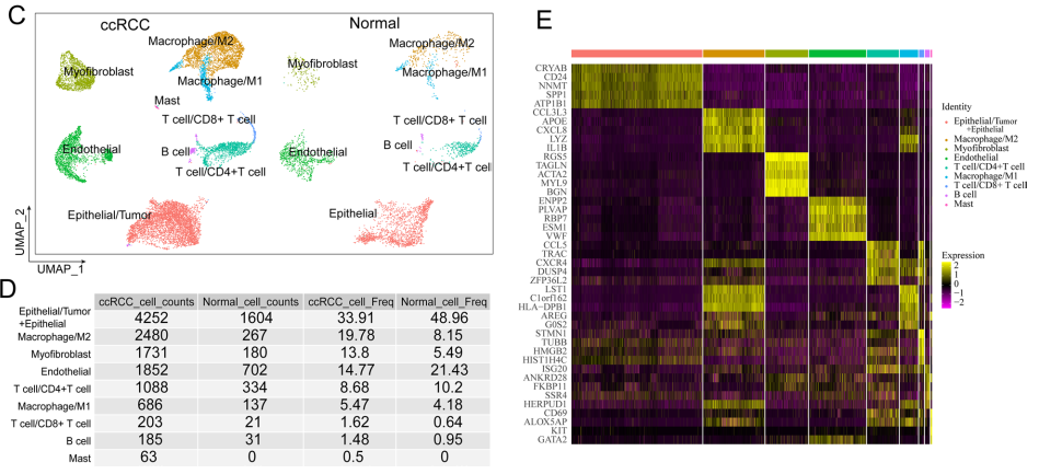 根据注释结果,ccRCC样本的“上皮/肿瘤”组成比例为4252(33.91%),而正常肾组织样本的上皮细胞组成比例为1604(48.96%),共计5856个细胞(图1D)。差异表达的前 5 个基因代表了 9 种不同细胞类型的转录谱(图 1E)。