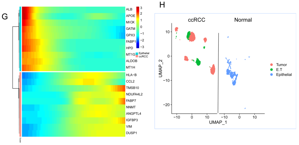 此外,在肿瘤细胞中,观察到与细胞增殖(TMSB10、IGFBP3)、迁移(CCL2)、信号转导(DUSP1)和其他行为相关的基因的激活(图3G)。由于 ccRCC 的肿瘤簇 2、5、11 和 12 保留了上皮细胞的转录特征,文中将其定义为上皮肿瘤细胞 (E.T) 并将它们标记为 C2-E.T,C5-E.T,C11-E.T 和 C12-E.T(图 3H)。就单个细胞的转录特征而言,这些E.T细胞表现出介于上皮细胞和恶性细胞之间的中间转录状态。起源于上皮细胞的癌症在发展的早期阶段保留了其上皮细胞特征。作者推测,这些E.T簇可能在肿瘤发展的早期阶段发挥关键作用,保留了与肿瘤发生相关的异常信息。