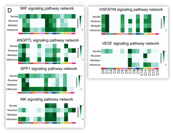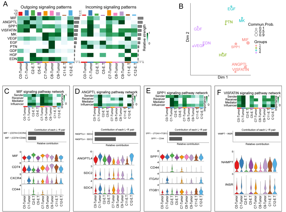 作者专注于研究 TOP4 信号通路(MIF、ANGPTL、SPP1 和 VISFATIN),它们对细胞簇之间的细胞间信号转导贡献最大。对于MIF信号通路,MIF信号的主要发送方是C2-E.T 簇,而最关键的信号接收器是 C7-Tumor 簇。MIF信号的传输主要通过LR对MIF-(CD74 + CXCR4)和MIF-(CD74 + CD44)进行。除了CD44,它只在C2-E.T和C7肿瘤细胞簇中表达,所有受体和配体基因在这9个细胞簇中广泛表达(图6C)。我们使用相同的分析方法检查了 ANGPTL、SPP1 和 VISFATIN 信号通路(图 6D-F)。值得注意的是,C2-E.T 细胞簇也是 SPP1 信号的最主要发送者,而这些信号的主要影响者和接收者是 C1-肿瘤簇(图 6E 中的热图)。