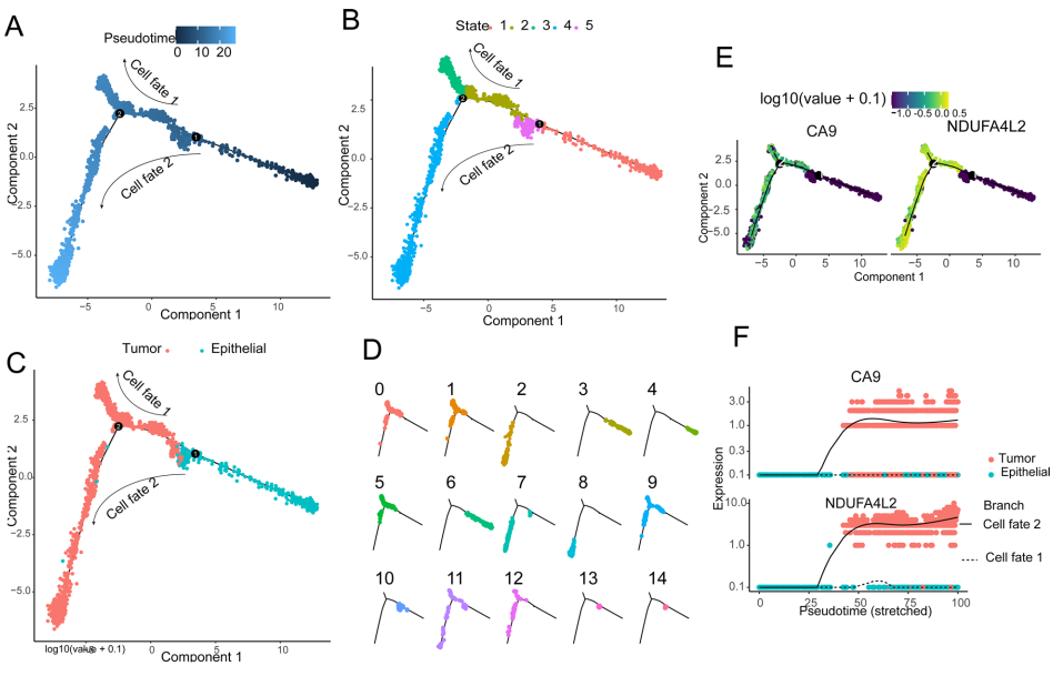 最后,文中使用scRNA-seq轨迹分析进一步验证了注释结果。首先构建了 15 个细胞簇的分化轨迹,并确定了 5 种不同的细胞状态(图 3A、B)。通过由细胞命运(cell fate)1 和细胞命运(cell fate)2 组成的发育轨迹可以观察到将上皮细胞转化为恶性细胞的过程(图 3C)。由6个细胞簇(3、4、6、10、13、14)组成的分化轨迹主要代表上皮细胞分化的轨迹和细胞状态1、5。由其余9个细胞簇组成的分化轨迹主要代表肿瘤细胞分化轨迹和细胞状态2,3,4(图.3D)。观察到 CA9 和 NDUFA4L2 在从上皮细胞到恶性细胞分化的一致轨迹上动态表达变化(图 3E、F)。