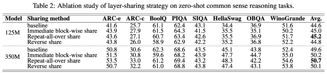 下表 2 结果表明,重复层共享策略在立即块重复、全面重复(repeat all-over)和反向共享策略中产生了最佳性能。