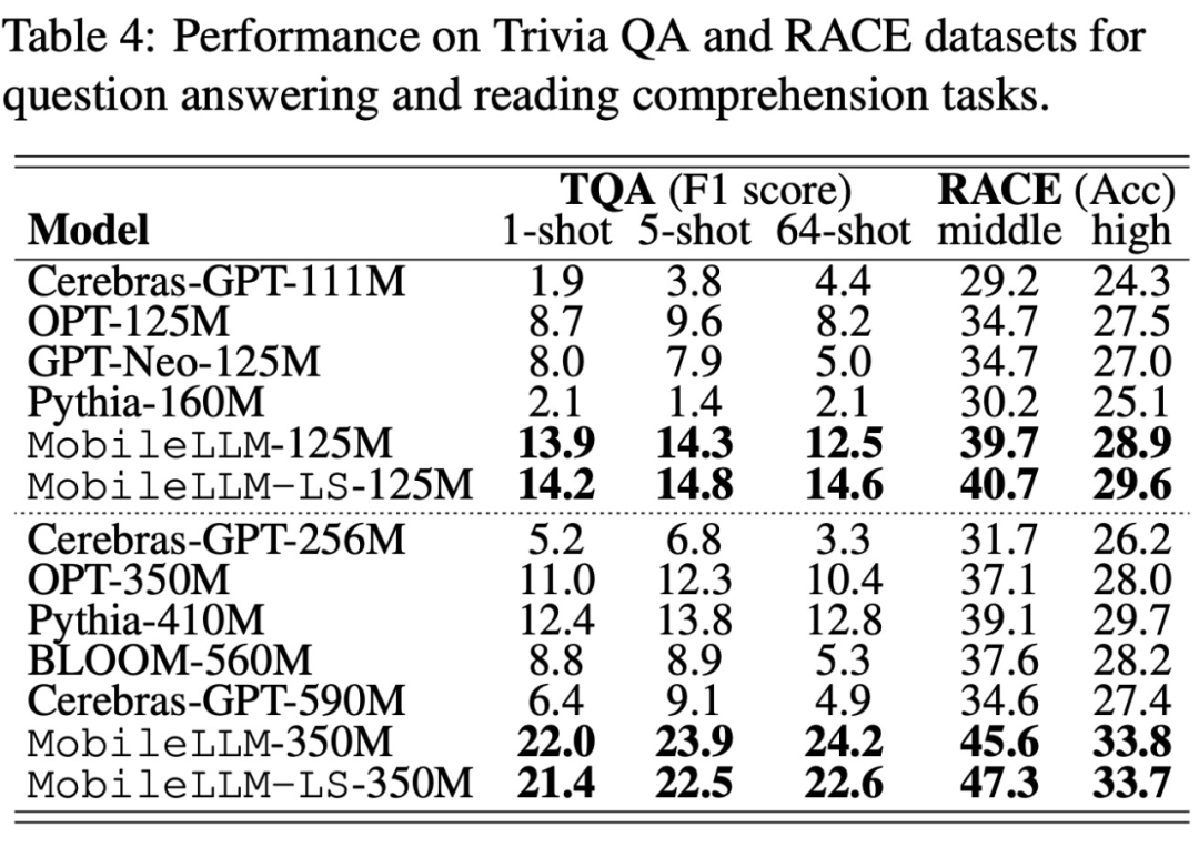 在问答和阅读理解任务上,该研究采用 TQA 问答基准和 RACE 阅读理解基准来评估预训练模型,实验结果如下表 4 所示: