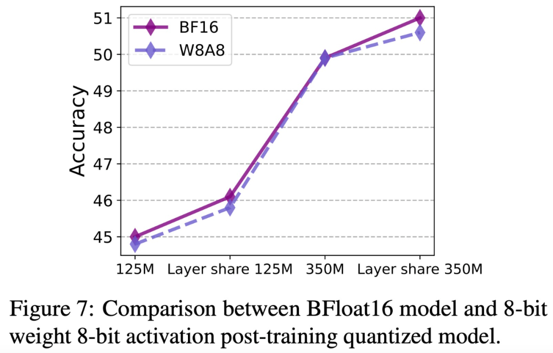 该研究进一步在 MobileLLM 和 MobileLLM-LS 模型上针对每个 token 进行最小 / 最大训练后量化 (PTQ) 实验,模型大小分别为 125M 和 350M,在 0.25T token 上进行训练,实验结果如下图 7 所示: