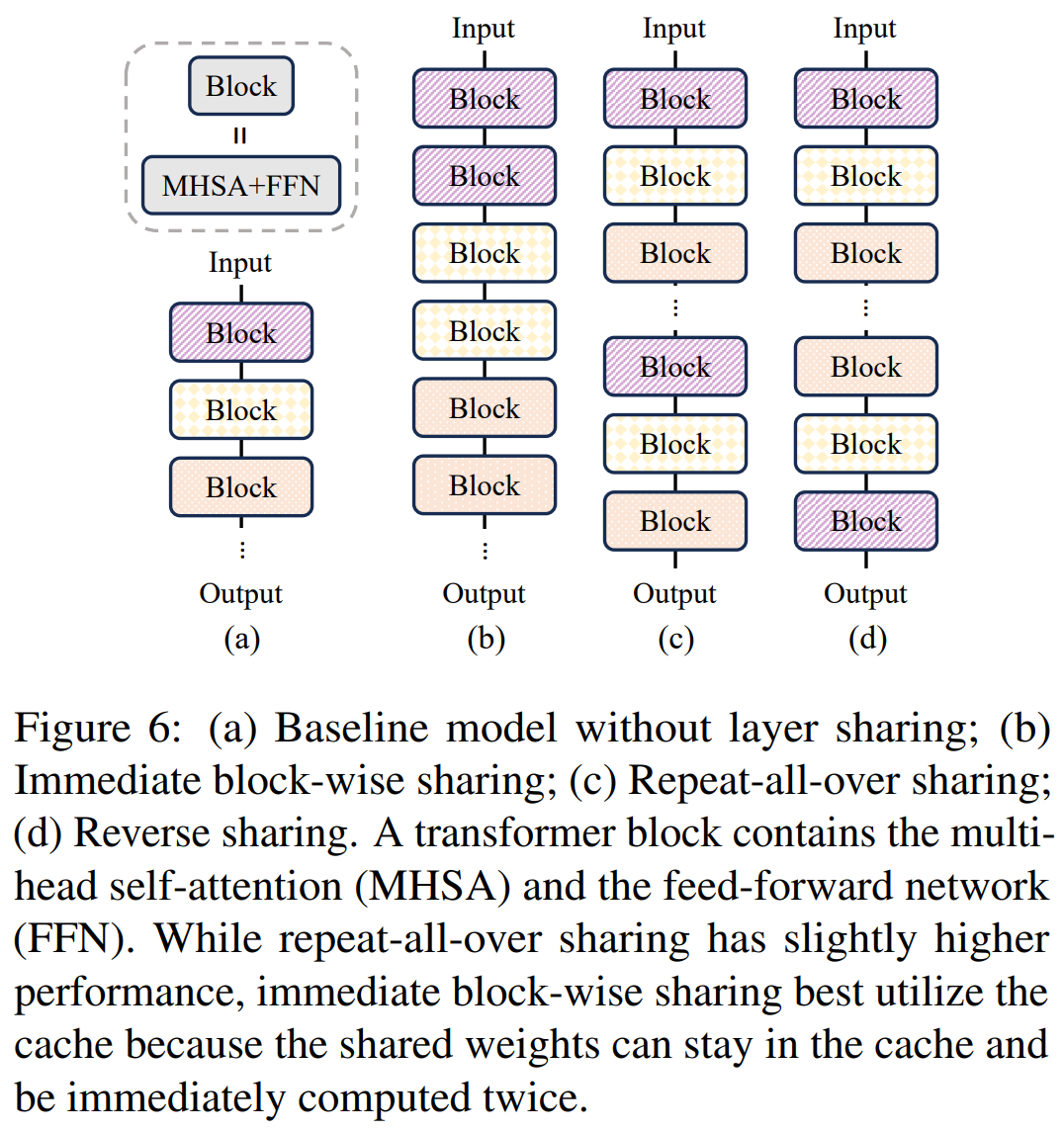 令人惊讶的是,实验结果表明,通过简单地复制 transformer 块就可以提高准确度而无需任何架构修改或扩大模型尺寸。研究者进一步探究三种不同的权重共享策略,具体如下图 6 所示。