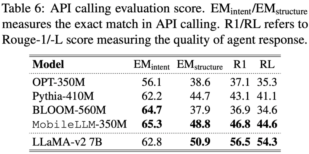 在 API 调用方面,如下表 6 所示,MobileLLM-350M 表现出与 LLaMA-v2 7B 相当的 EM_intent 和 EM_structure,其中 EM_intent 越高,表明模型对用户计划调用 API 的预测就越准确,而 EM_structure 反映了预测 API 函数内内容的熟练程度。