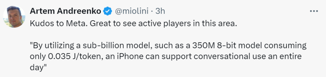 看到这项研究后,网友纷纷表示「我们应该向 Meta 致敬,很高兴看到这个领域的活跃玩家。该机构通过使用低于 10 亿参数的模型,并且 350M 8 位模型的能源消耗仅为 0.035 J/token ,要是部署在 iPhone 上的话,可以支持用户一整天的会话使用。」