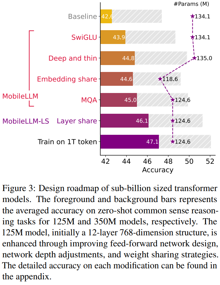 研究者介绍了从十亿以下参数规模的基线模型到新的 SOTA 模型的演进之路(如下图 3 所示)。他们分别研究了 125M 和 350M 参数规模的模型,并在这两个规模下展示了一致的改进。对于模型尺寸成为主要制约因素的设备用例而言,如何有效地分配有限的权重参数变得比以往更加重要。