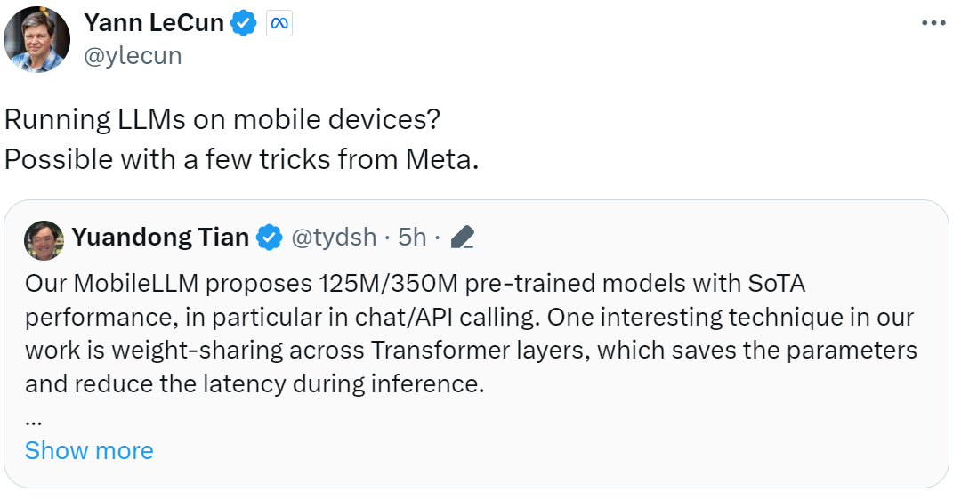 「在移动设备上运行 LLM?可能需要 Meta 的一些技巧。」刚刚,图灵奖得主 Yann LeCun 在个人社交平台表示。