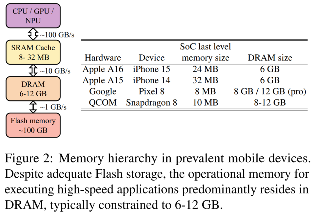 此外,在当前的移动技术领域,由于主内存(DRAM)容量的限制,将像 LLaMAv2 7B 这样的 LLM 与 8 位权重整合起来代价过高。移动设备中普遍的内存层结构如图 2 所示。随着 DRAM 容量从 iPhone 15 的 6GB 到 Google Pixel 8 Pro 的 12GB 不等,一个移动应用不应超过 DRAM 的 10%,因为 DRAM 需要与操作系统和其他应用程序共享。这一要求促进了部署小于十亿参数 LLM 更进一步的研究。