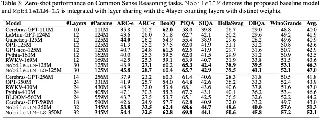 田渊栋表示:「我们的 MobileLLM 预训练模型(125M/350M),性能达到 SoTA,特别是在聊天 / API 调用方面表现出色。此外,本工作中的一个有趣研究是跨 Transformer 层的权重共享,这样不仅节省了参数,还减少了推理过程中的延迟。」
